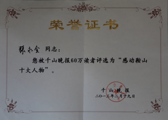 在《千山晚報(bào)》創(chuàng)刊20周年之際,很榮幸獲得《千山晚報(bào)》評(píng)選的“感動(dòng)鞍山十大人物”。