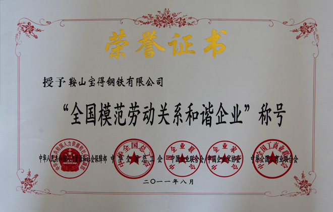 2011年8月15日,在北京召開的全國構建和諧勞動關系先進表彰暨經(jīng)驗交流會上,公司被國家人力資源和社會保障部、中華全國總工會、中國企業(yè)聯(lián)合會、中國企業(yè)家協(xié)會、中華全國工商業(yè)聯(lián)合會表彰,并授予“全國模范勞動關系和諧企業(yè)”稱號。鞍山市僅寶得公司一家企業(yè)獲此殊榮。